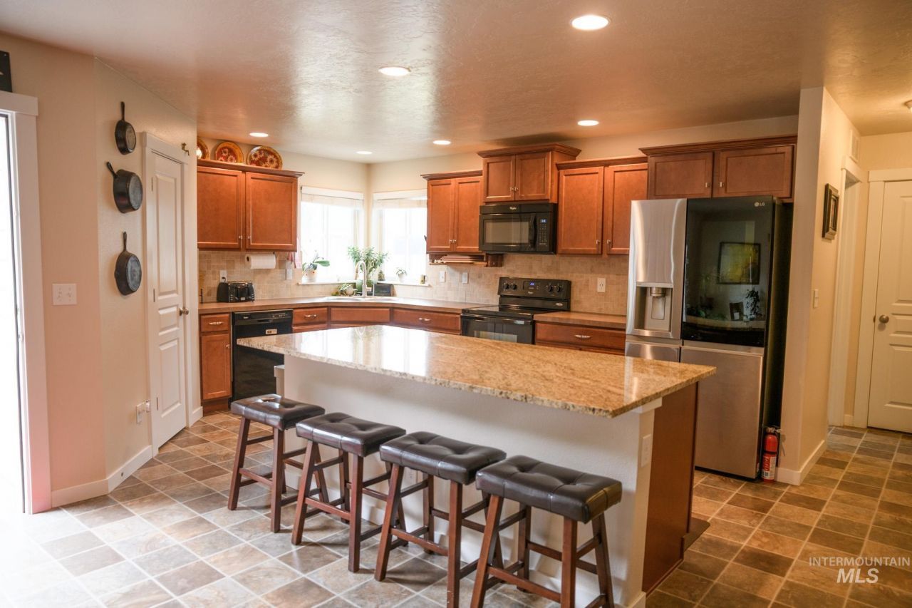 A real jewel! A well cared for 5 bedroom, 2 1/2 bath home in a desirable Kuna neighborhood! Over 2,700 sq ft of living space. Living room with a gas fireplace to relax or entertain. Beautifully designed kitchen features a granite countertop island, title backsplashes, pantry, lots of cabinet space and open dining area. A guest room/den/office on the main level. Master bedroom upstairs, walk-in closet, soaker tub and walk-in shower. Additional 3 bedrooms conveniently located upstairs, and loft space is a great reading/computer/game area. 3-car garage provides storage and parking. Two-year-old exterior paint. Enjoy fully fenced vinyl backyard with hot tub and awesome pavilion provides privacy and relaxation.
