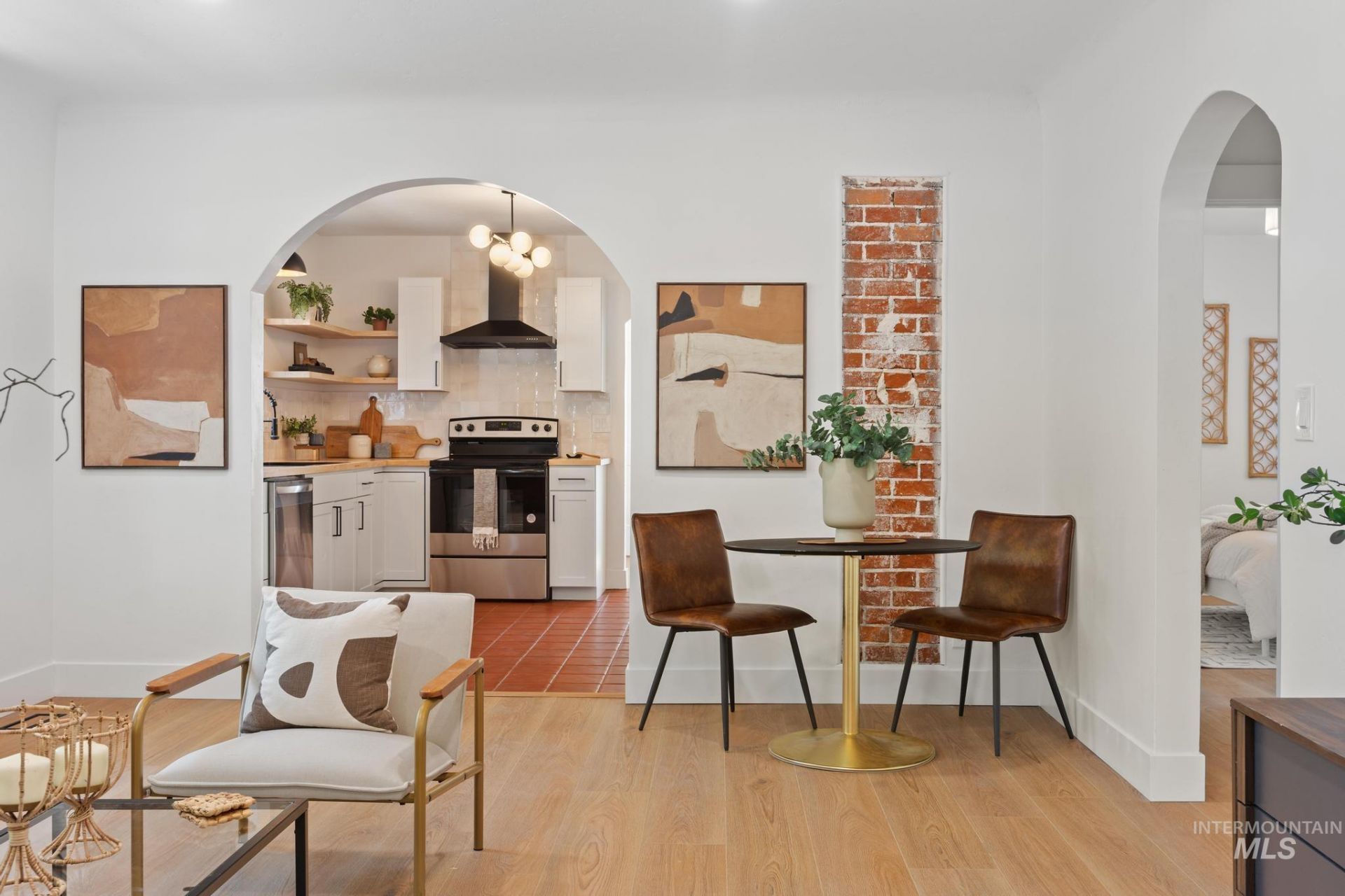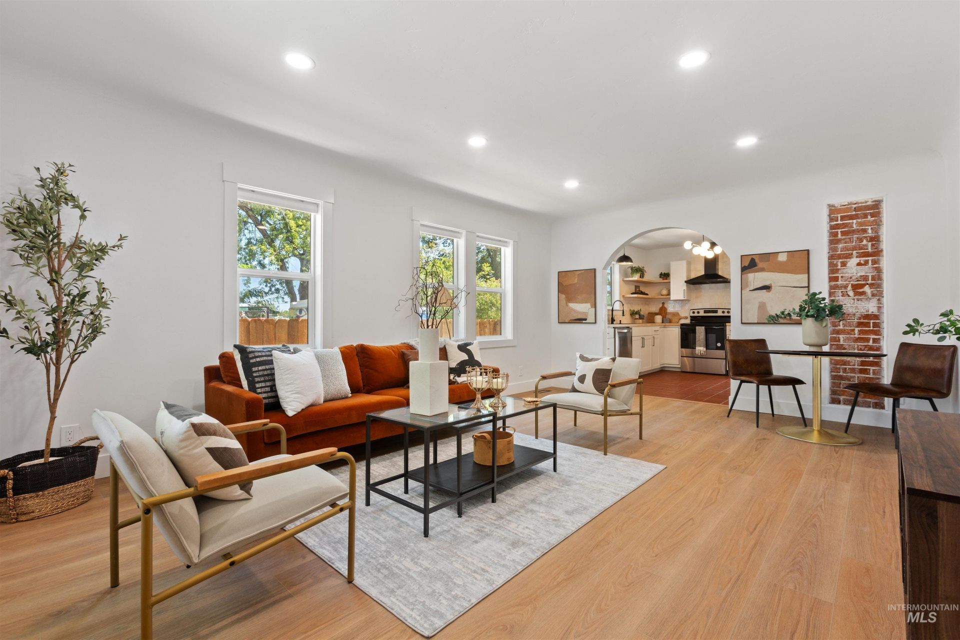 This beautifully remodeled bungalow captures the warmth of its era while offering the comfort and style of a modern home. Step inside to find sunlit spaces that highlight graceful arched doorways, charming built-ins, and touches of exposed brick. The layout flows effortlessly, with generous living areas and a spacious downstairs bonus room perfect for gathering or relaxing. A stylish new kitchen and updated bathrooms complement the homes character, while a brand-new roof, HVAC, and detached two-car garage provide peace of mind. Outside, the zero-scaped front and back yards create a low-maintenance space. Set in a quiet, established neighborhood, this home is just a short stroll to Idahos largest private school and the dining, shopping, and community energy of downtown Meridian. Every detail has been thoughtfully completed, allowing you to simply move in and enjoy.