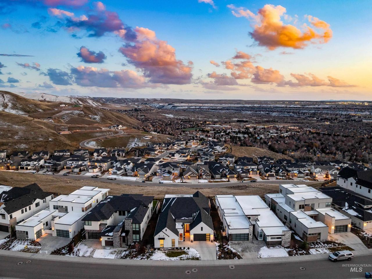 Experience the finest luxury living that NE Boise has to offer in this modern Harris North property. Enjoy incredible views of the Boise Foothills off the main living areas and primary suite. Abundant natural light floods into this open concept single level floor plan. Expansive kitchen with Wolf appliances and butlers pantry. The main area includes a linear fireplace and sliders that open up to the covered patio with premium low maintenance turf. The real show stopper of this space is the wine cellar, finished with glass walls and a climate controlled humidifying system. Large primary suite with dual vanities, and a luxurious walk in shower opposite the soaking tub. This property lives large with a guest suite, Jack and Jill bedroom with shared bathroom, bonus room and a den. Two separate garage bays fitting three units finished with epoxy floors. Upgrades include real hardwood floors, built in audio speaker system with upgraded low voltage package, two dishwashers, under cabinet lighting, premium cabinetry with dovetail cabinet drawers, electric blinds and more! Harris North includes a community pool, easy access to DT Boise, local rivers, parks and Lucky Peak recreation.