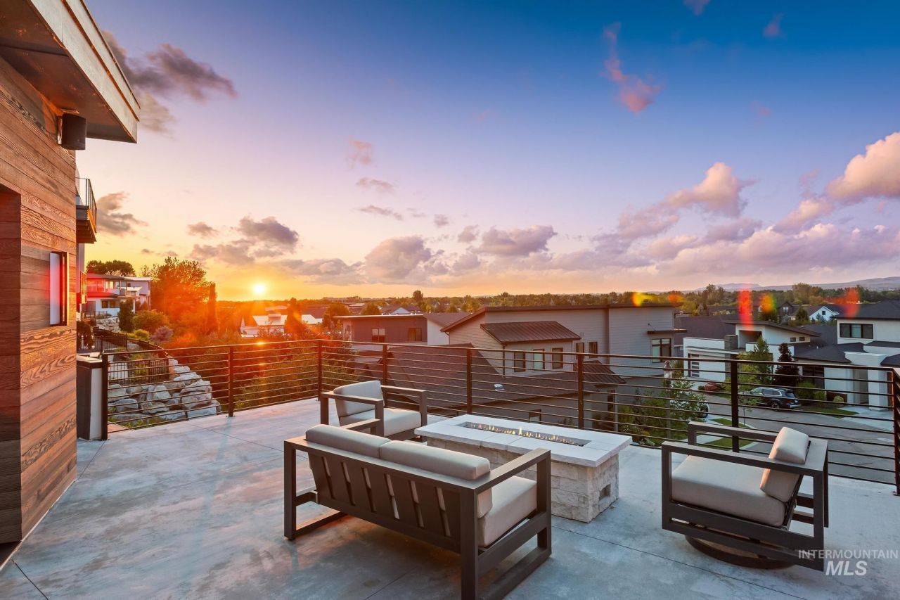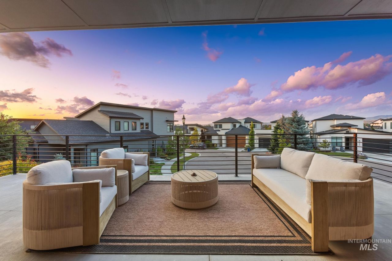 This exceptional residence blends architectural design with elevated riverfront living, offering 3,300 square feet of refined luxury and over 1,600 square feet of wraparound patio space with breathtaking Boise River and Foothill views. Expansive outdoor living areas create the perfect setting for sunset entertaining and year-round relaxation. Inside, striking design elements include a statement vertical reeded feature wall and a floating solid oak staircase set against a dramatic stone accent wall. The chefs kitchen is thoughtfully appointed with premium Thermador appliances, quartz countertops, a full slab backsplash, and custom cabinetry. The owners bath delivers spa-level luxury with a 67-inch resin soaking tub, Carrara marble accent wall, and fully tiled walk-in shower. Interior highlights include engineered hardwood floors, 8-foot interior doors, a linear fireplace with custom pre-cast surround, and integrated smart-home audio and WiFi systems. Marvin black-framed windows, multi-point sliding doors, and exterior soffit heaters seamlessly blend modern style with everyday comfort. The oversized garage features an 18-foot Amarr door and more than 900 square feet of epoxy-finished flooring. Every detail of this home has been meticulously curated to impress.